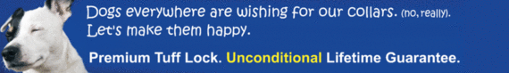 Premium Tuff Lock is manufactured in Carlsbad, California and we stand behind our product 100%. All items are covered by our UNCONDITIONAL LIFETIME GUARANTEE - the best one in the collar universe! Any damaged item is replaced - even if a dog chews it in two.